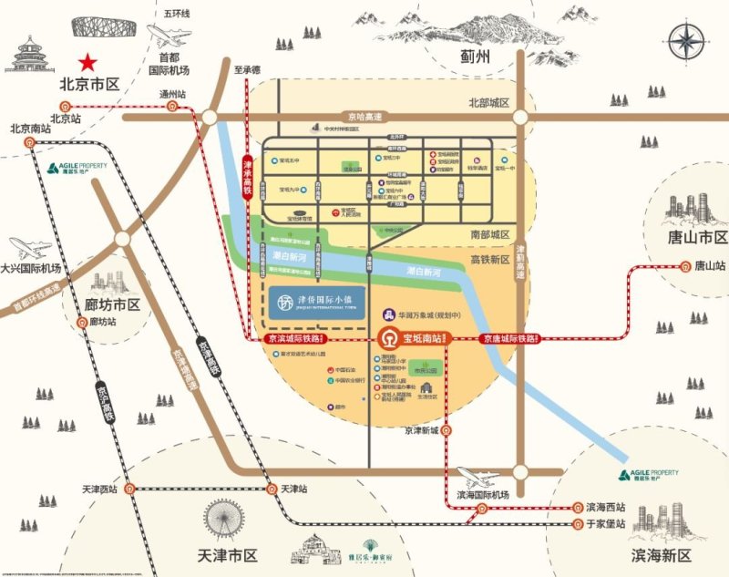 随着高铁新城建设进程的提速,未来城市南移将带动人口的大流动。开云棋牌注册就送 ·津侨国际小镇作为高铁新城的时代封面,是推动宝坻高铁经济发展的“排头兵”,更是打造展现宝坻城市形象的新窗口,发展重点;大量资源、配套、政策向此倾斜。本次首开产品更是地块内距离高铁站最近的产品,举步即达,未来京唐、京滨、津承三条城际线路交汇于此,宝坻将成为天津、北京、唐山三城经济区交汇中心点。不久的将来,从此至北京通州仅需18分钟,半小时内抵达天津市区、唐山、滨海新区。宝坻的跨越发展,触手可及,居于此的生活,即可享受京津冀城市圈生活的繁华与便利。