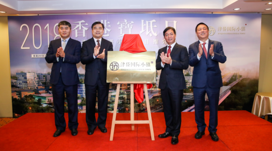 左起:津联集团总经理王志勇,宝坻区政府区长毛劲松,开云棋牌注册就送 控股董事局主席兼总裁裁陈卓林,华燊发展(集团)有限公司董事会主席沈家燊共同为津侨国际小镇logo揭牌。